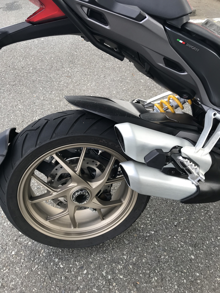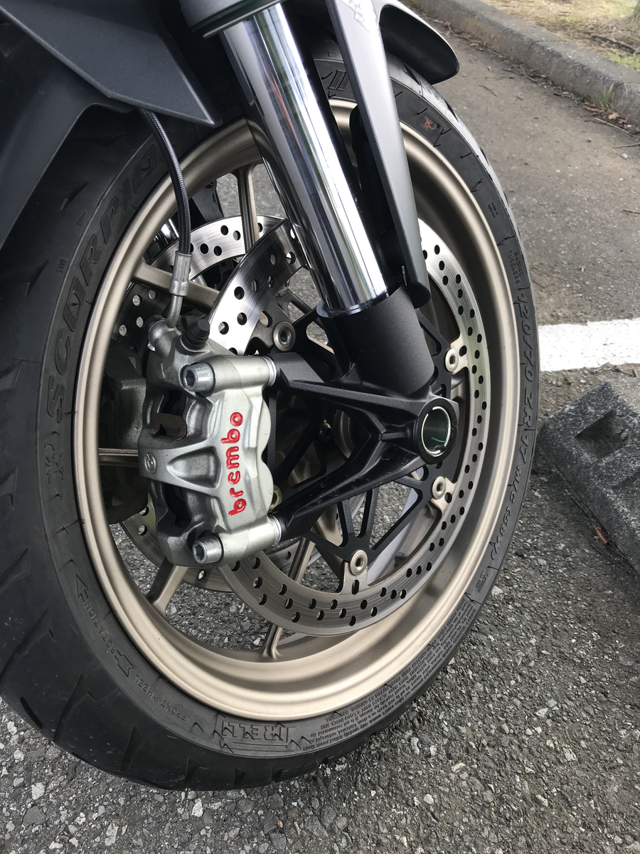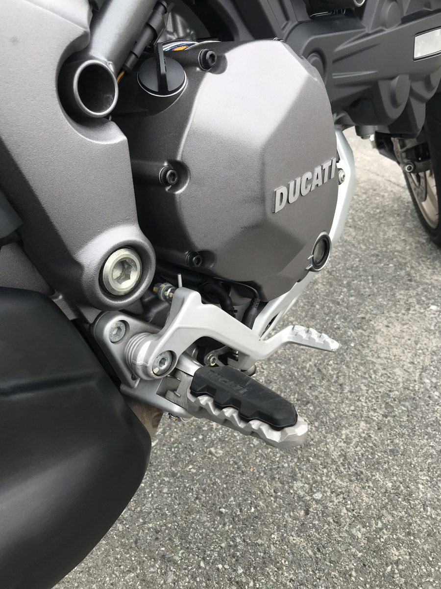 ドゥカティといえば決まった時のハンドリングは素晴らしいが、決まらないと全然曲がらない難しいバイクというイメージがあるが、ムルティストラーダに関してはそこまでの神経質さはない。ただ、ダラっと乗ってると操っているというより乗せられているような感覚がなんとなくあるのは確かである。ある程度エンジン回転を上げて、アクセルオンの時のトラクションも、オフの時のバックトルクもリアタイヤにしっかり伝え、ブレーキングでフロントに荷重を移して、ブレーキリリースに合わせてスパッと寝かせてやるとよく曲がる。なるほどこれがドゥカティなのかと思う瞬間である。そんなわけでリーンウィズで乗るより、ハングオフスタイルで腰を落とし、シートからしっかりリアに荷重する乗り方の方が楽しい。前述した高めのステップも効いてくる。前後タイヤの接地感も非常に高い。