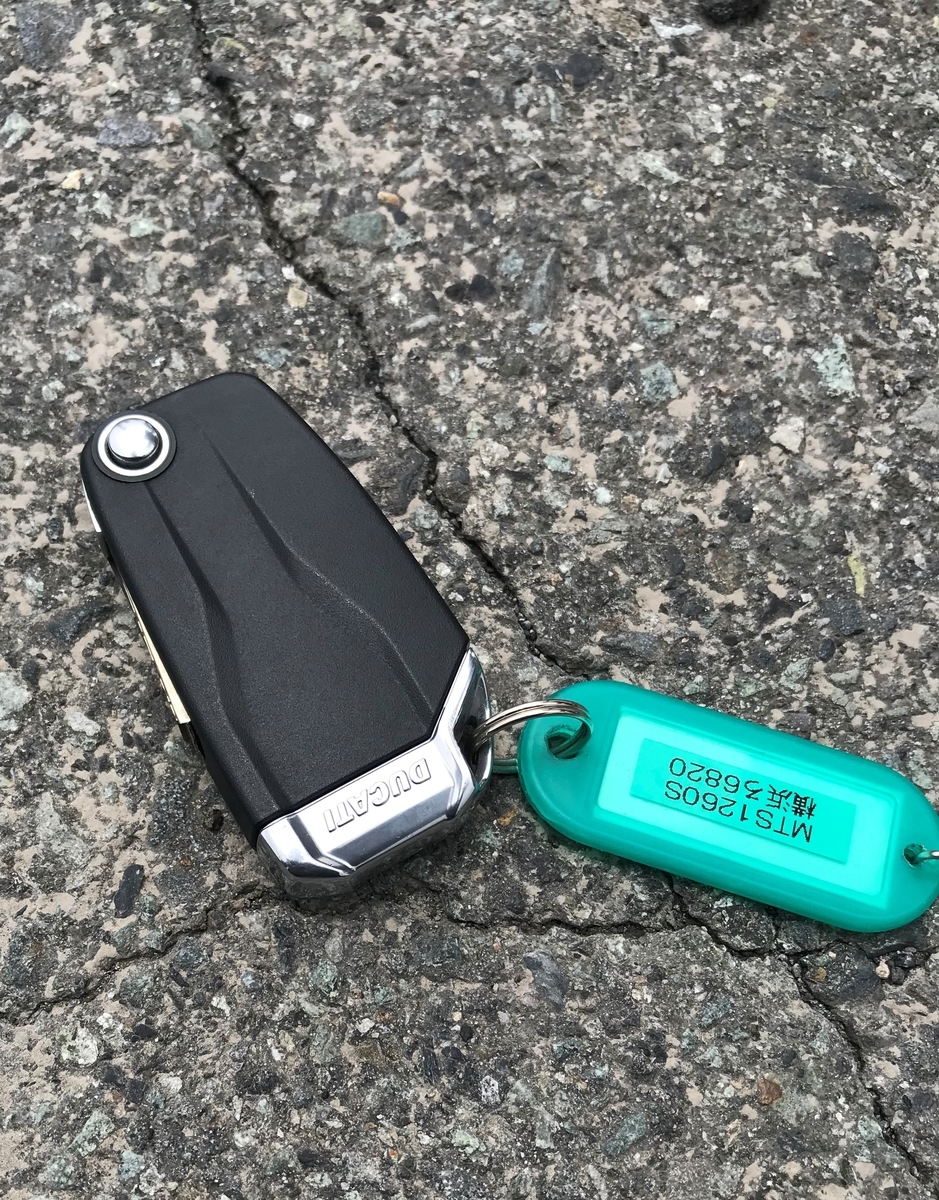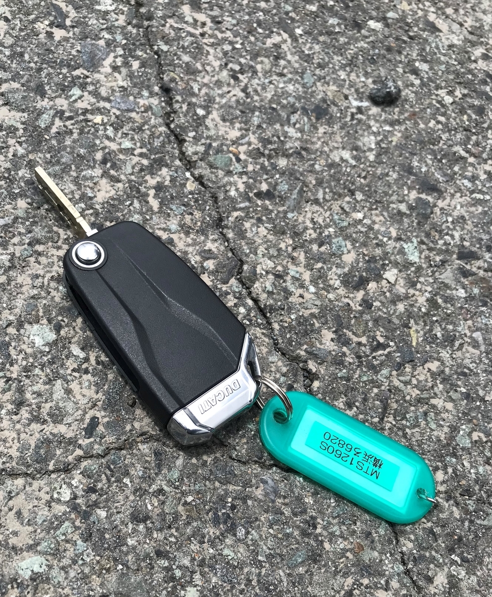 キーはリモコン式。いちいち鍵穴に挿さなくていいのは楽。タンクキャップを開ける際はボタンを押すと鍵が出てくるので、それで開ける。