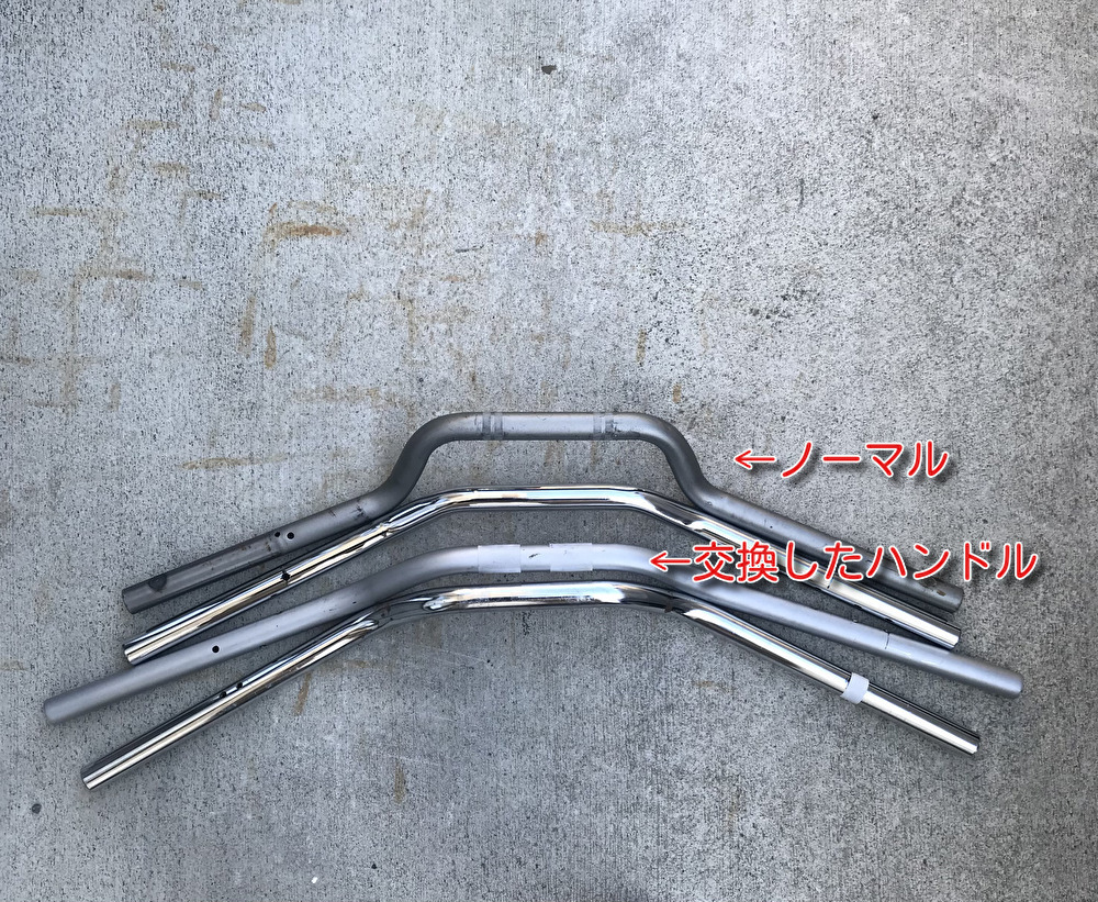 上の写真はうちにあったハンドルを並べたもの。一番上がノーマルで、上から3番目が今回交換したハンドル。ノーマルが幅670mmなのに対して交換したハンドルは約770mm。写真で見てわかるとおり絞り角が少なくて、ノーマルが23°なのでおそらく20°をちょっと切るくらいか。高さは写真では分からないが、だいたいノーマルよりバー1本分(約2cm)くらい低い。