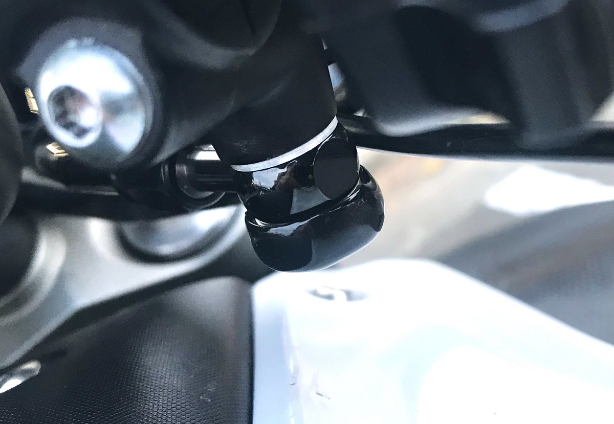 特別なことはないが、MTはタンクが盛り上がっていて右にいっぱいにハンドルを切るとマスターシリンダーのバンジョーボルトが当たってしまう。ハンドルの取り付け角度を色々調整してみたが結局どうにもならないので、バンジョーボルトに下のようなボルト用保護キャップをかぶせてタンクに当たっても傷つきにくいようにした。