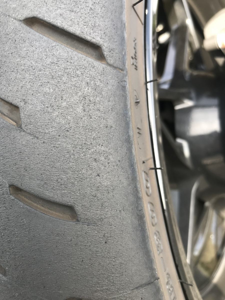 ノーマルで装着されてるGPR300は割と平べったい形なのか、そんなにバンクさせてないのに端に近いところまで接地する。